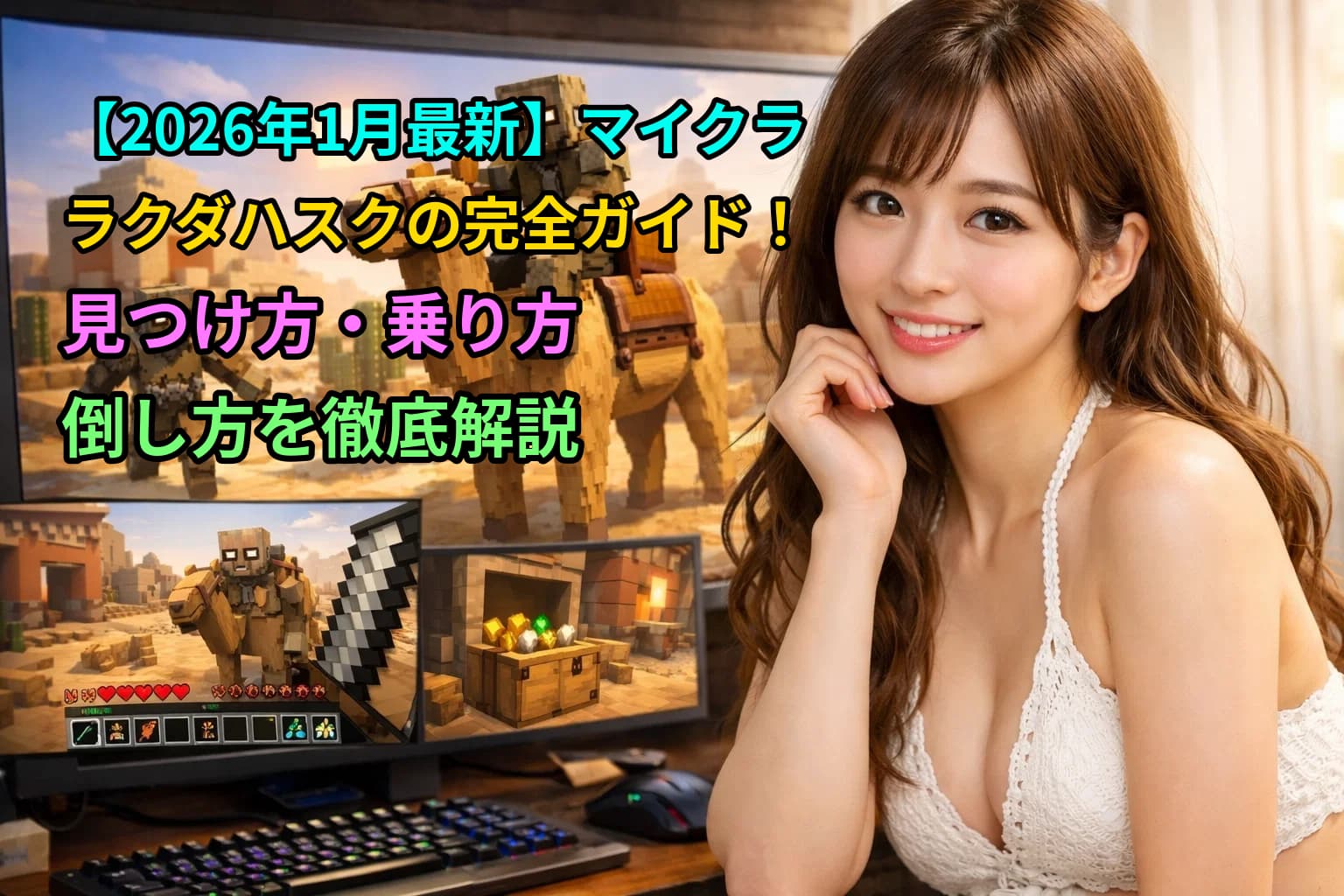 ラクダハスクは、2025年12月配信のゲームドロップ「マウント・オブ・メイヘム(Mounts of Mayhem)」で追加された、砂漠の夜にスポーンするアンデッド系の新マウントです(日本時間では2025年12月10日に配信開始)。砂漠バイオームで明るさ0の地表に、槍持ちハスクとパーチド(新スケルトン亜種)を背中に乗せた「ラクダハスクジョッキー」として出現します。背中の敵対モブ2体を倒せば、通常のラクダと同様に鞍で操作でき、2人乗りで移動可能です。回復にはウサギの足を使い、繁殖はできません。