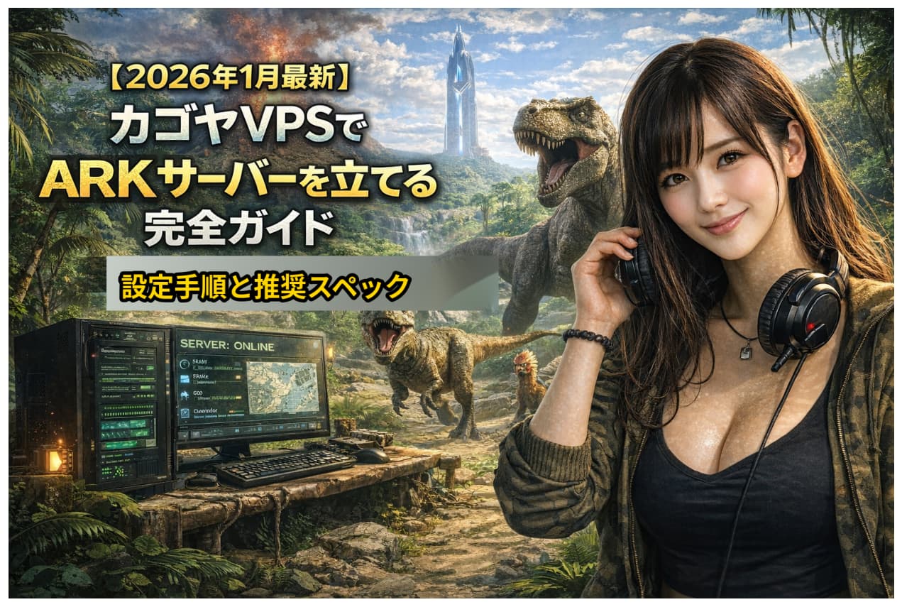 カゴヤVPS(KAGOYA CLOUD VPS)を使ったARKサーバー構築は、最安で月額上限550円(1GBプラン)から利用できます。ARK: Survival Ascended(ASA)の専用サーバーはLinuxにネイティブ対応しておらず、Windows(またはWine/Proton等のWindows互換環境)が前提です。Linux(Ubuntu)で運用する場合は、SteamCMDで取得できるサーバーファイルがWindows版である点を踏まえ、Wine/Proton等を使う構成になります。安定運用の目安はメモリ8GB以上で、人数やMOD量に応じてスケールアップするのが現実的です。料金・プランは2026年1月時点の公式掲載に合わせて更新しています。