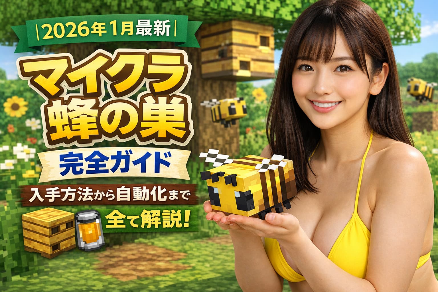 マイクラの蜂の巣(Bee Nest/以下「蜂の巣」)は、ワールドに自然生成するものを見つけるか、苗木成長時の生成抽選で作り出して入手できます。一方、養蜂箱(Beehive)はハニカム3個+板材6個でクラフト可能で、蜂の巣と同様にミツバチの住処として機能します。蜂の巣/養蜂箱からはハチミツ入りの瓶とハニカムが採取でき、焚き火やディスペンサー+コンパレーターを用いたレッドストーン回路で全自動化も可能です。