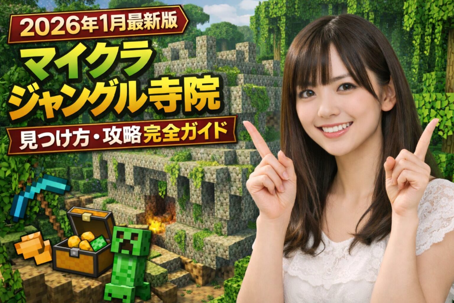 マイクラのジャングル寺院は、ジャングルバイオームに生成される古代遺跡で、貴重なチェストが2つ隠されています。見つけ方は、ジャングルバイオーム内で丸石・苔むした丸石の構造物を探すか、/locate structure minecraft:jungle_pyramidコマンドで座標を確認する方法があります。寺院内部にはレバーパズルの隠し部屋とトリップワイヤートラップがあり、攻略すると密林風の装飾用鍛冶型・鞍・ダイヤモンドなどの貴重アイテムが入手できます。なお、Java版では竹林でも生成されます(まばらなジャングルでは生成されません)。