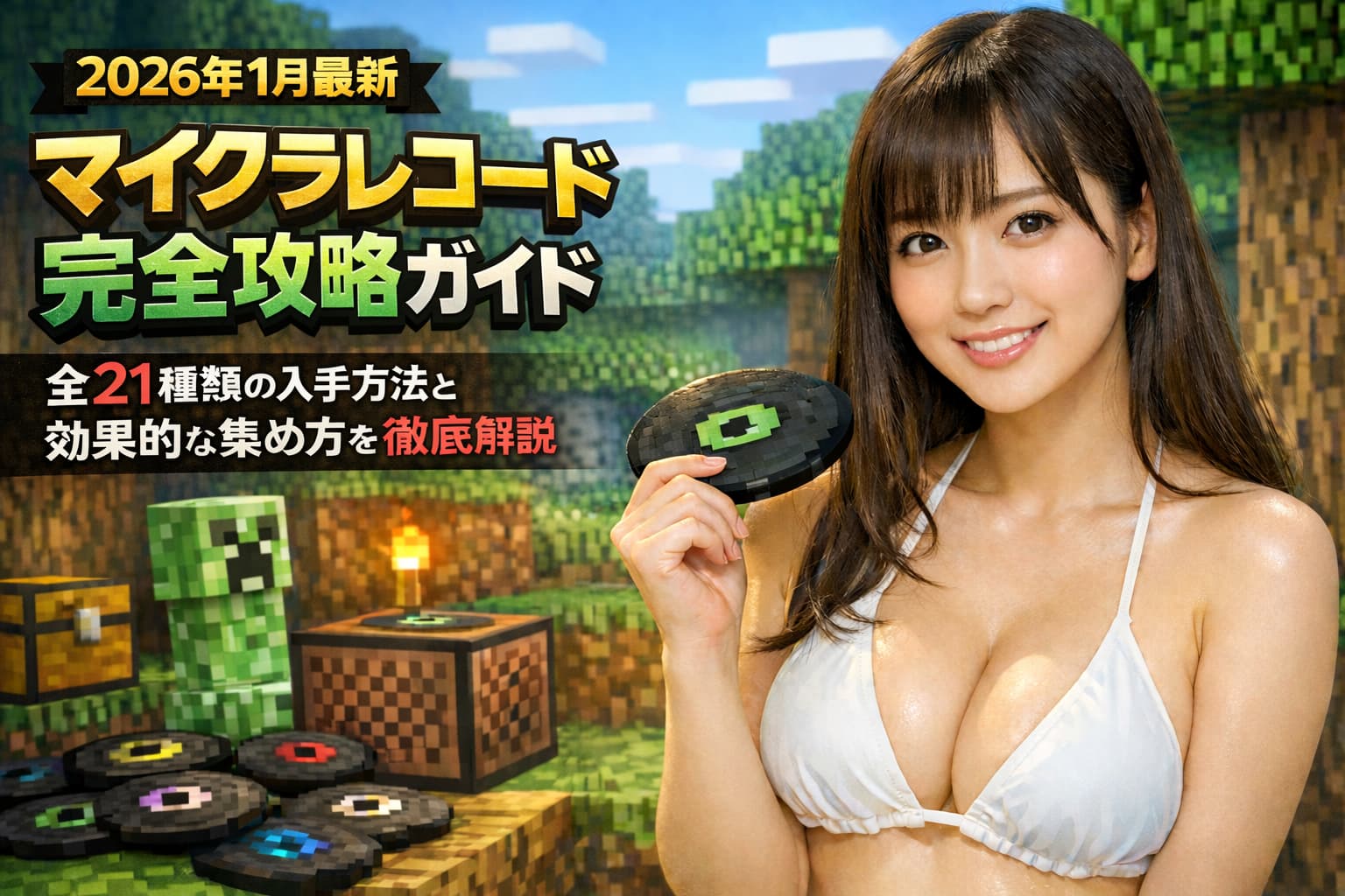 マイクラのレコード(音楽ディスク)は、2026年1月時点で全21種類です。入手方法は大きく分けて(1)スケルトン/ストレイにクリーパーを倒させる(基本12種)、(2)宝箱・考古学・トライアル(試練の間)由来の限定ディスク、(3)特定モブからの専用ドロップ(Tears / Lava Chicken)に分かれます。ジュークボックスに入れると楽曲が流れ、コンパレーターでディスク別の信号強度も取り出せるため、コレクションだけでなく装置づくりにも役立ちます。