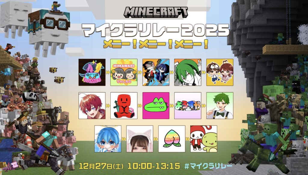 - マイクラリレー2025は12/27(土)10:00開始、43組の動画がリレー式でプレミア公開されます。