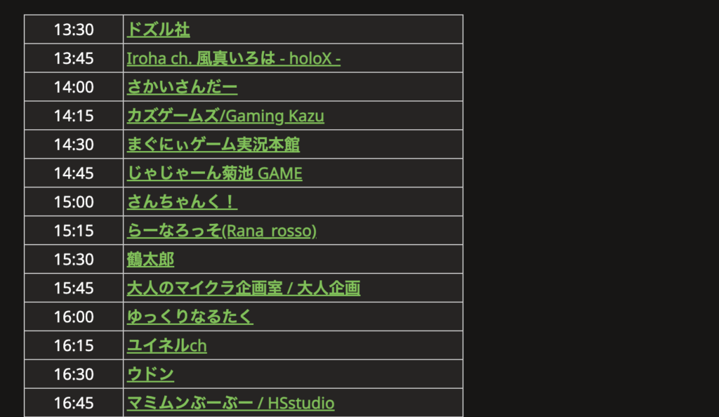 見方は簡単です。公式ページのタイムテーブルから、見たい枠のYouTubeリンクを開いてください。