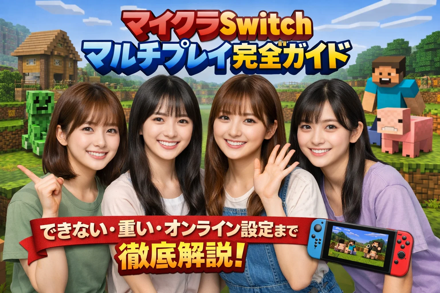 Nintendo Switch版マインクラフトのマルチプレイは、1台のSwitchで最大4人の画面分割プレイ、複数台のSwitchによるローカル通信(最大8人)、オンラインマルチプレイ(Nintendo Switch Online加入必須)、Realmsサーバー利用など4つの方法があります。最も人気のオンラインプレイでは、PC・スマホ・他のゲーム機とのクロスプラットフォーム対応で、友達と遠距離でも一緒に冒険できます。